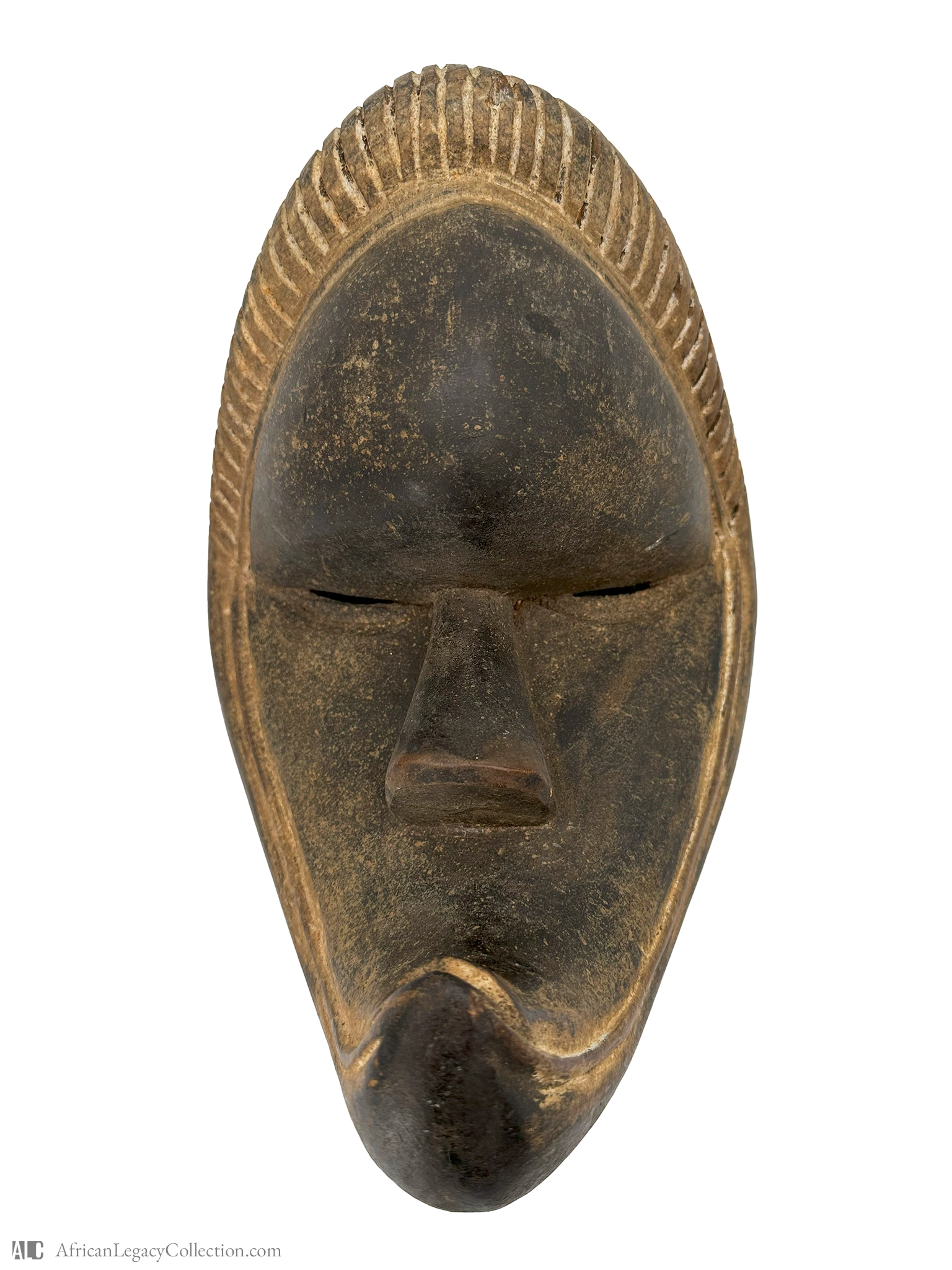 This mask is a finely carved wooden artifact originating from West Africa, commonly associated with cultural ceremonies and rituals. Its highly stylized, elongated features likely represent an ancestor or spirit and played a significant role in community events, possibly used in dances or storytelling sessions.
