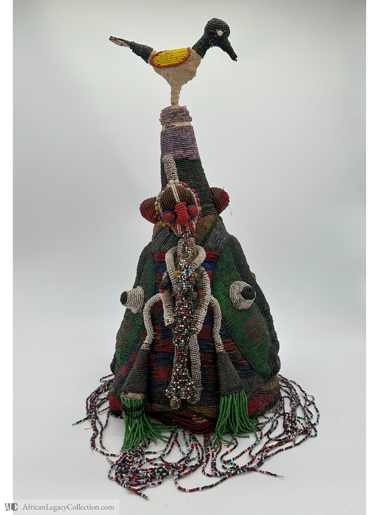 This intricately beaded headdress is likely used in ceremonial contexts and originates from the Yoruba people of West Africa. Often worn during festive and ritual occasions, such headdresses play a role in cultural storytelling and status display, symbolizing connection to spirituality and societal roles.