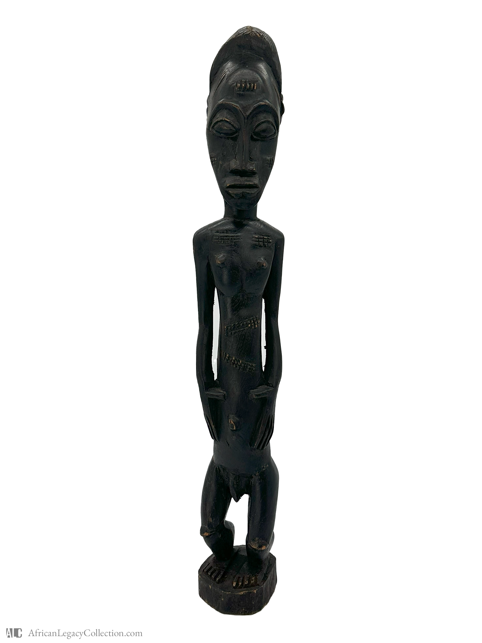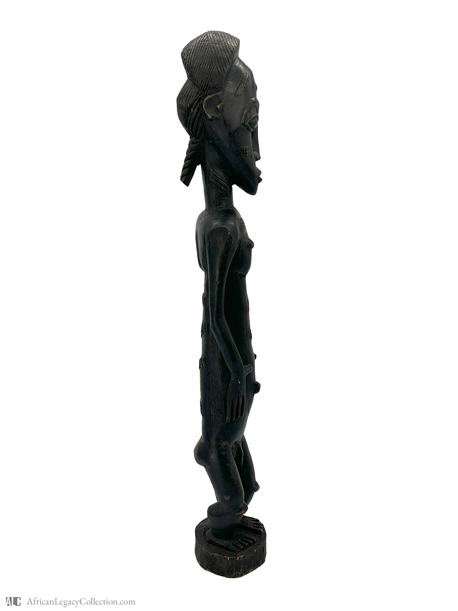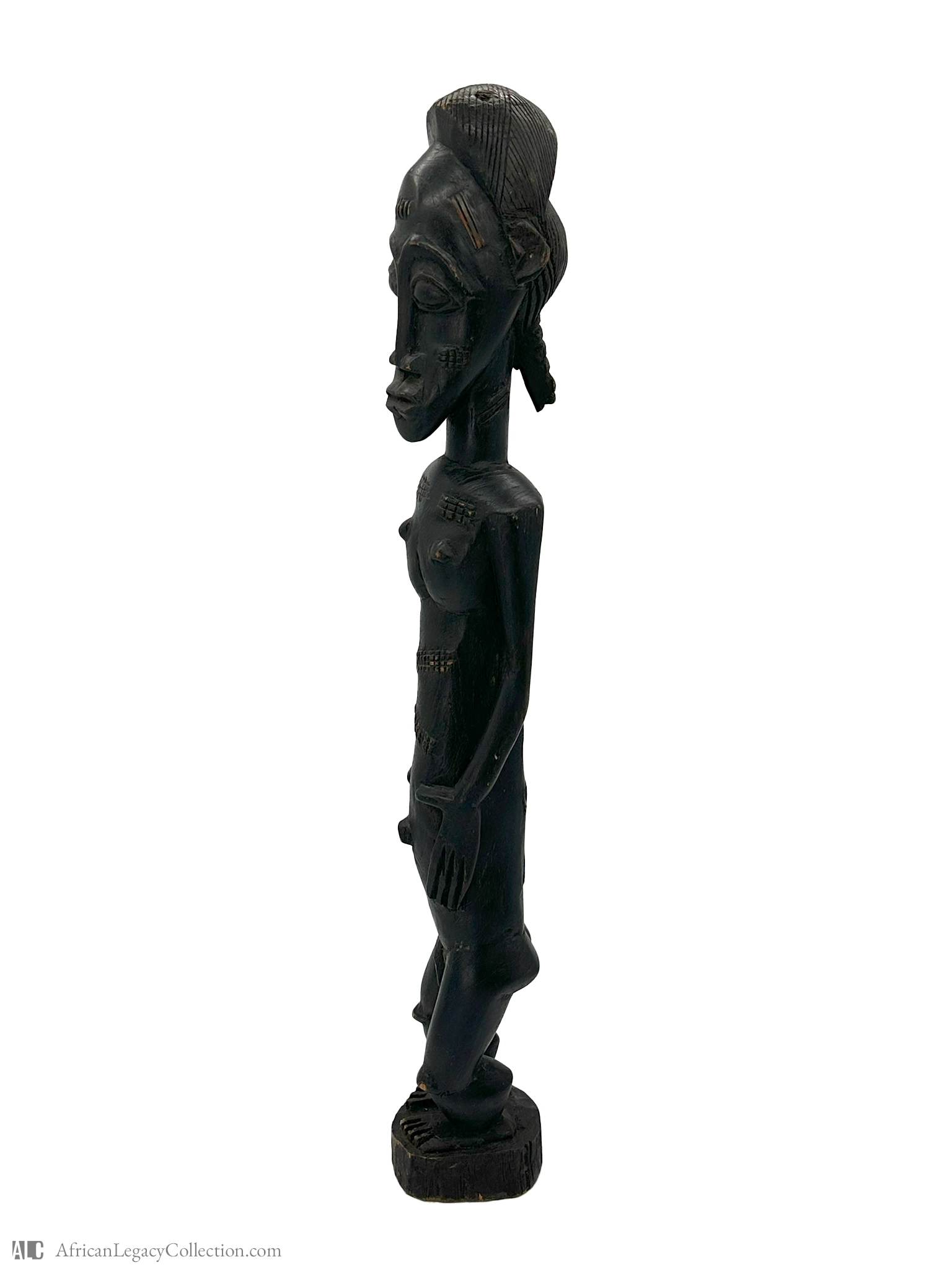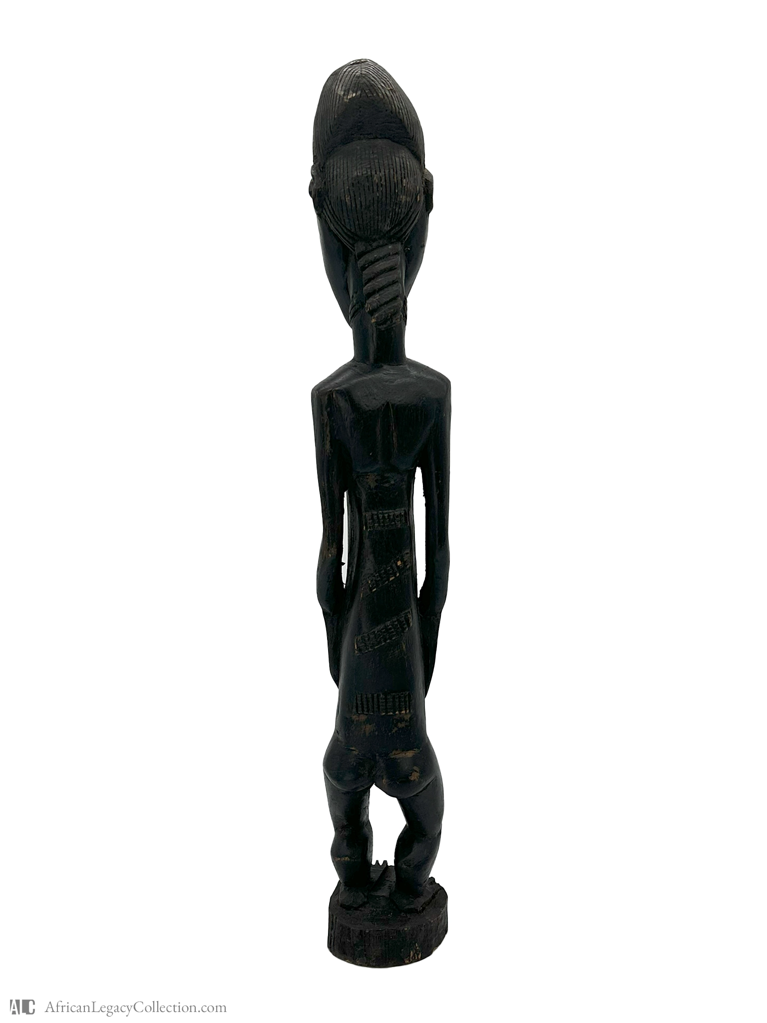 Crafted from a dark hardwood, the statue showcases expert carving techniques, evident in the detailed scarification motifs adorning the body. These motifs hold cultural significance, contributing to the piece’s historical context. Fertility figures like this one have played a pivotal role in cultural rituals and societal beliefs across African communities.