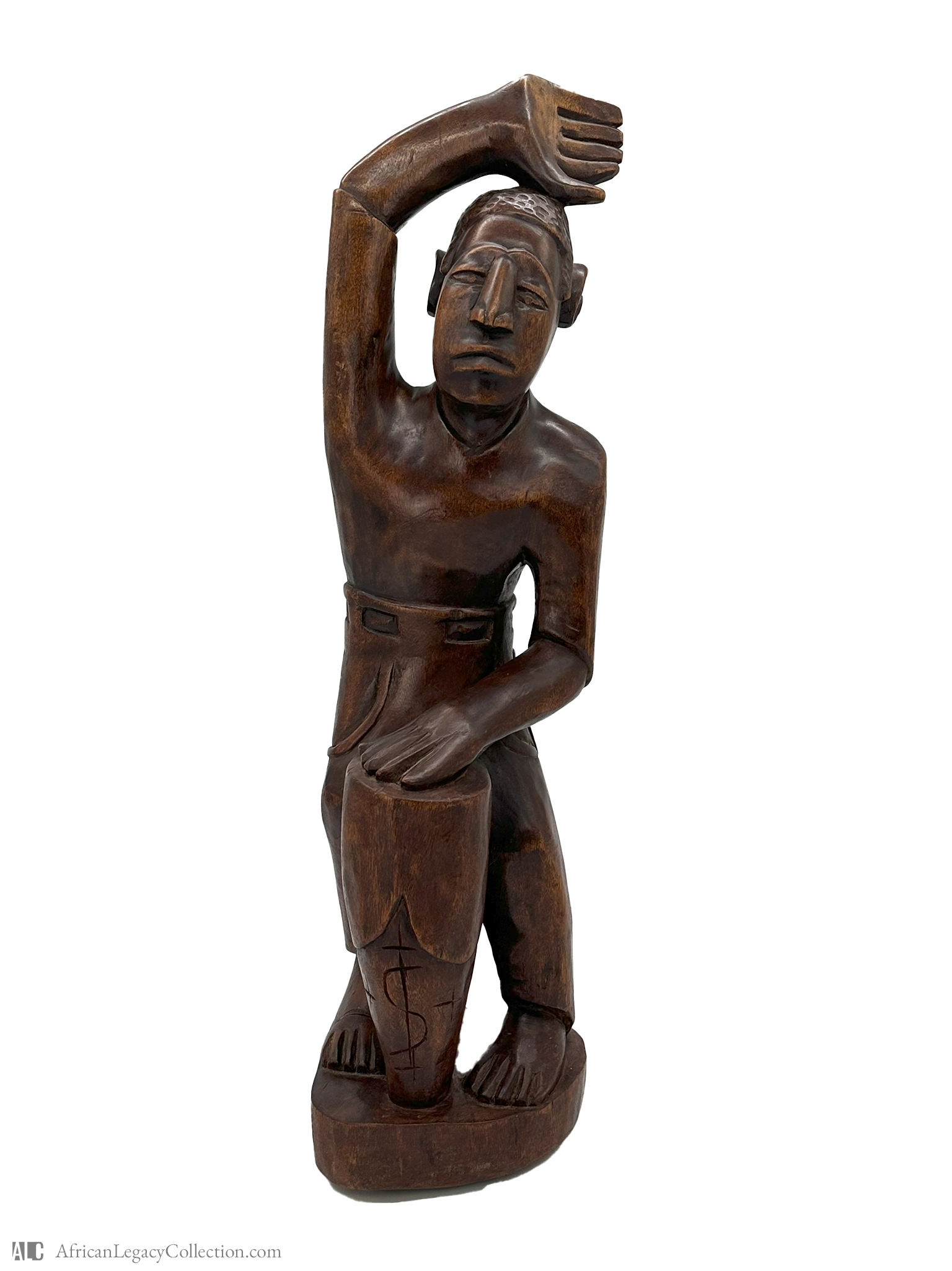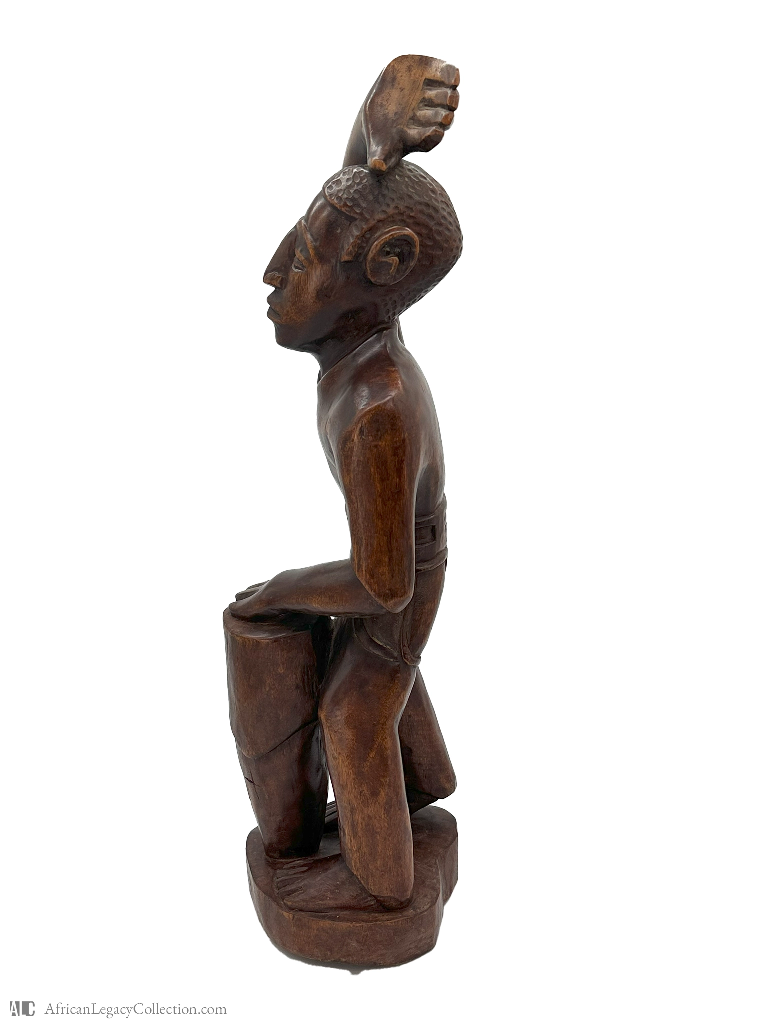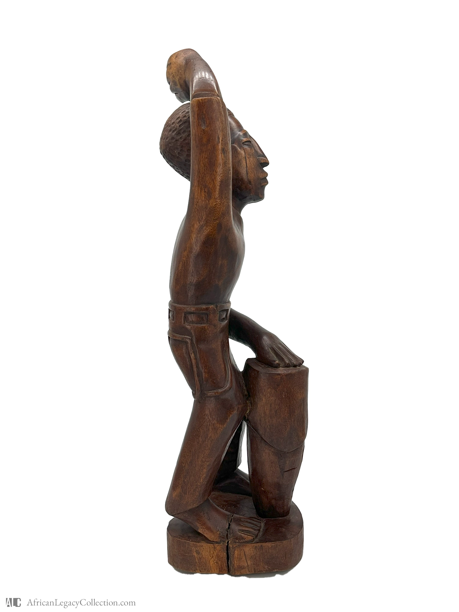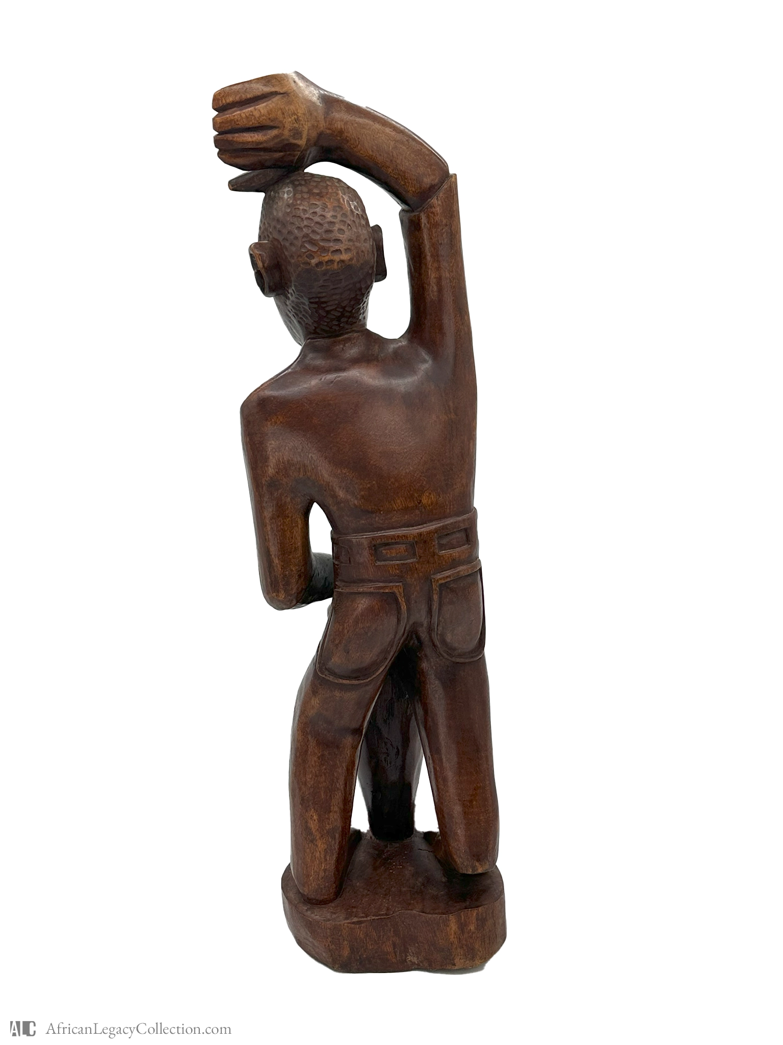 This carved wooden figure depicts a person in a dynamic pose, suggestive of a ceremonial or ritualistic role. Likely originating from West Africa, the statue embodies the cultural artistry associated with traditional African societies. Its expressive form and intricate carving suggest it may have been used in a ritualistic context, serving a symbolic or spiritual function.