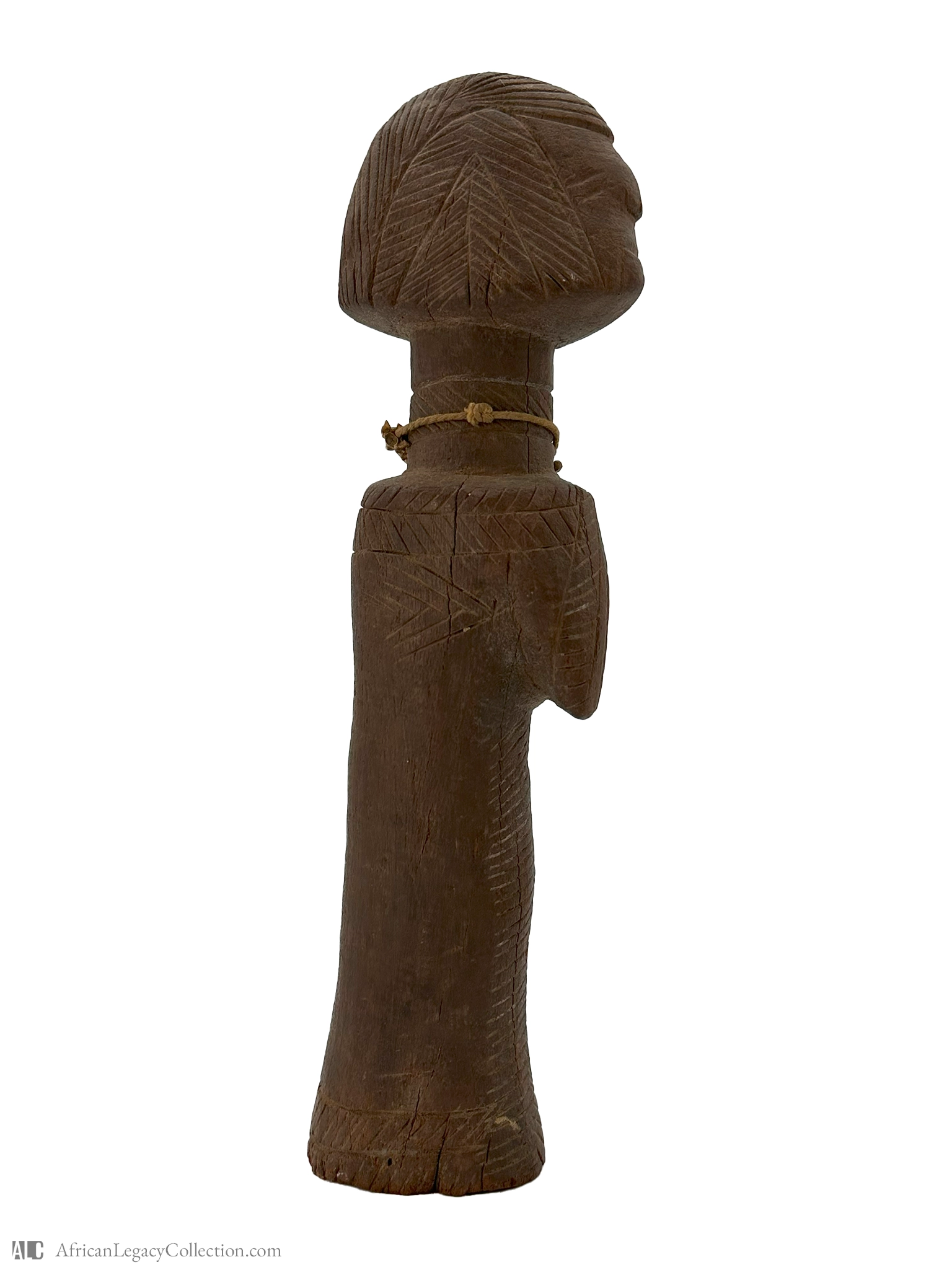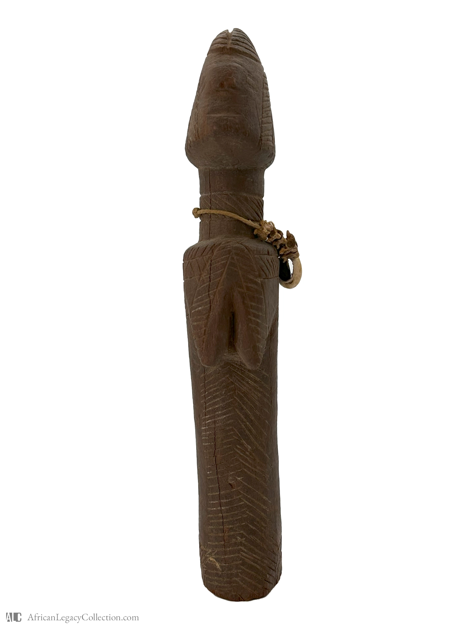 This wooden figure likely originates from West Africa and serves a ceremonial or protective role within the culture. Its simplistic form, combined with the characteristic incised striations, suggests it may represent an ancestral figure or spirit, often used in rituals or as a guardian object.