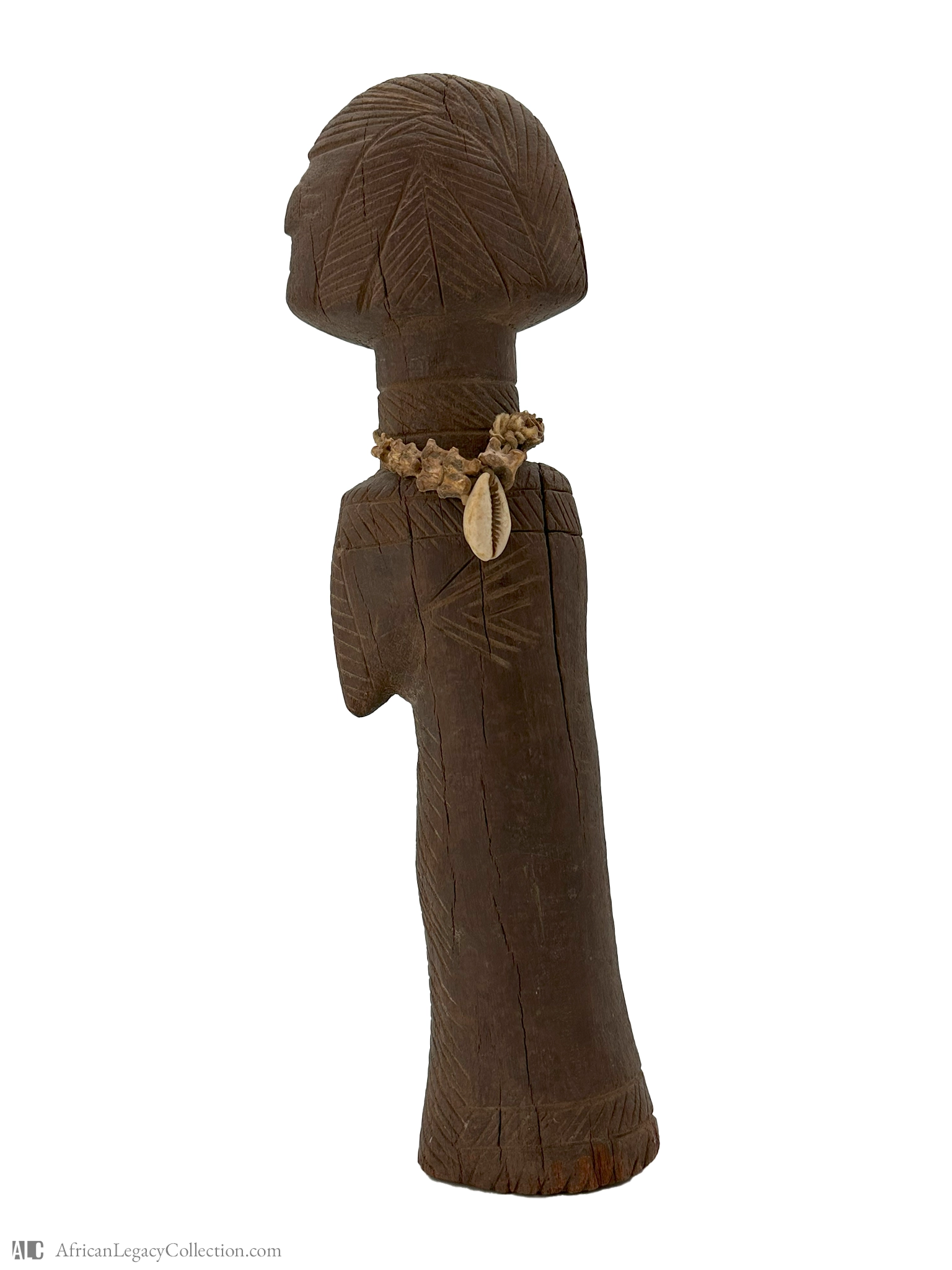 The figure is crafted from a single piece of wood, utilizing techniques such as incised striations for decorative detailing. The presence of a cowrie shell necklace indicates its cultural significance, often symbolizing wealth or protection. This artifact reflects the artistic traditions of African communities and their connection to ancestral heritage.