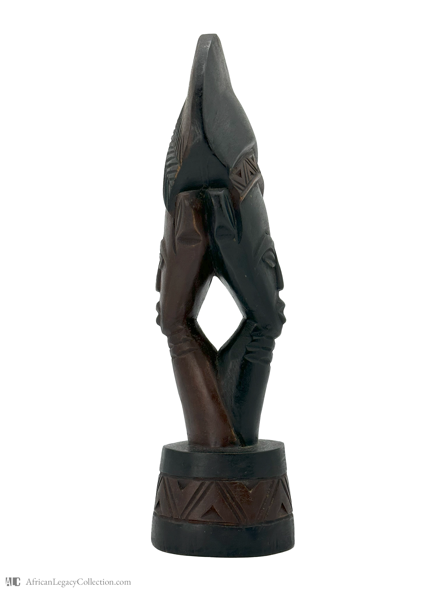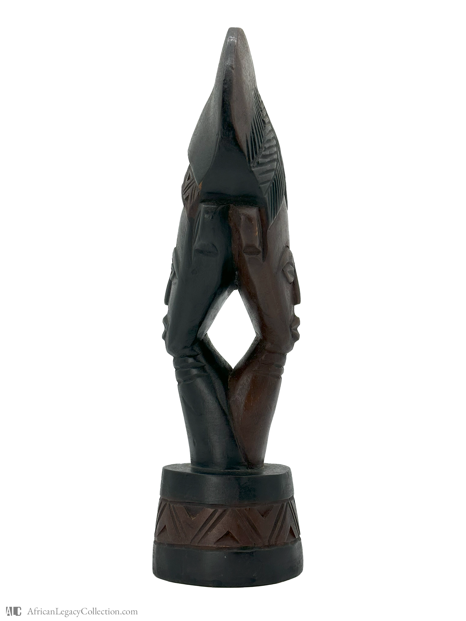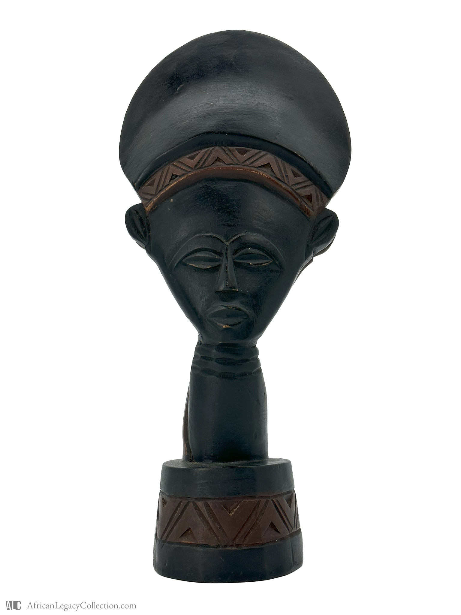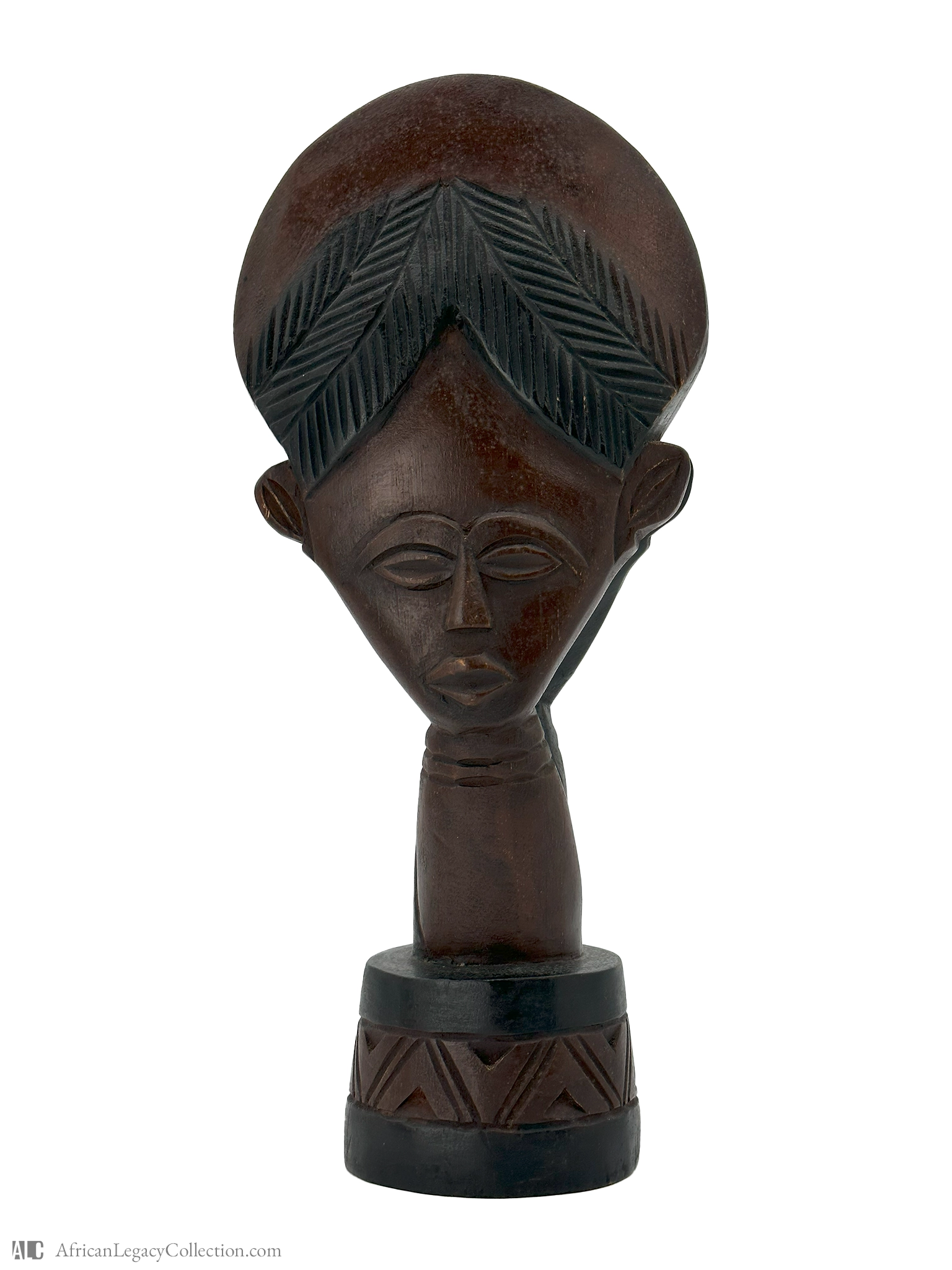 This artifact is a wooden African bust, likely originating from West Africa. The carved depiction of a stylized human face suggests its purpose was ceremonial, perhaps as an ancestral representation or part of a ritualistic tradition.