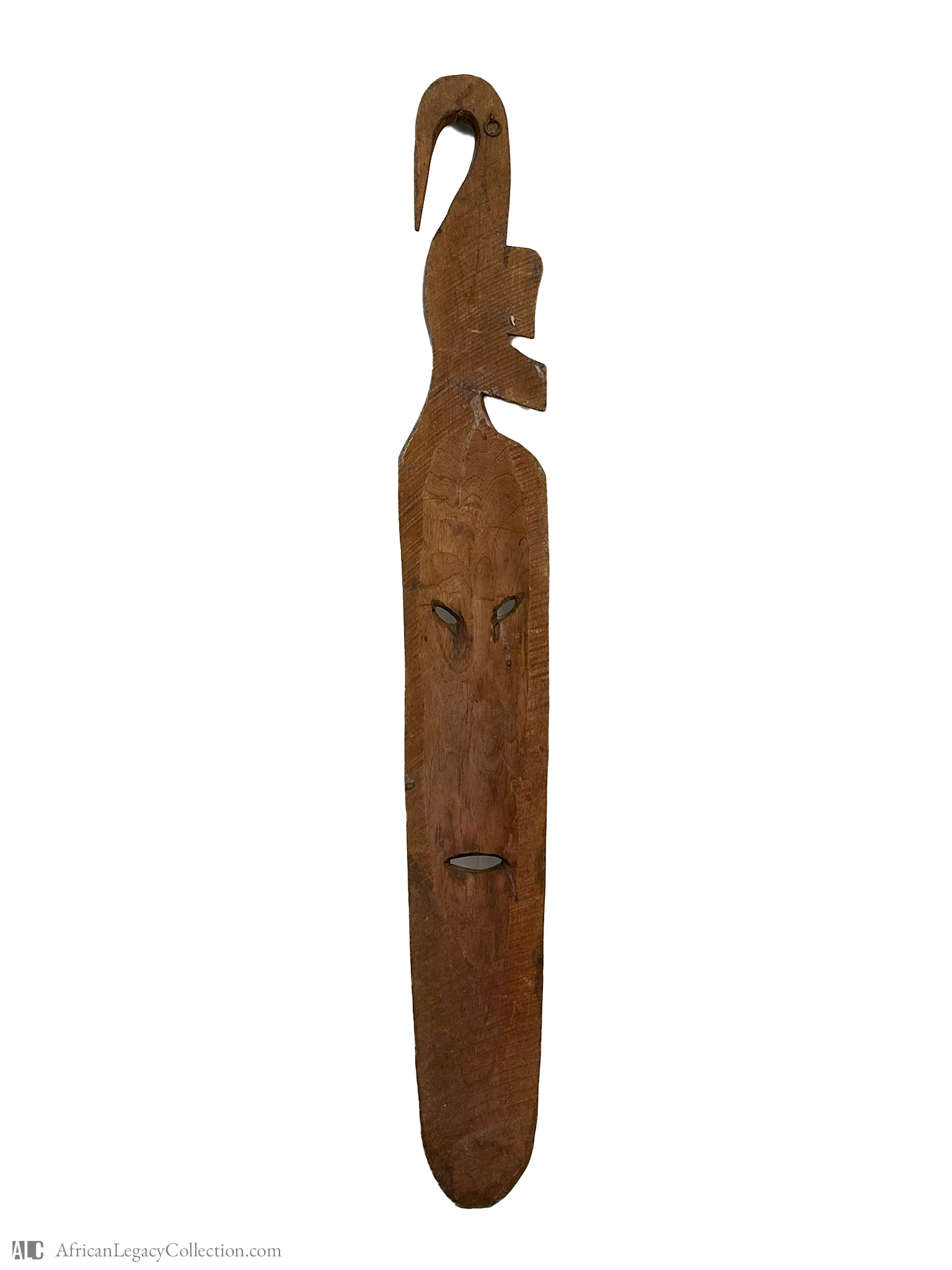 This carving likely originates from West Africa and is a mask with anthropomorphic stylization, possibly used in cultural or ritualistic ceremonies. The design features a long face with incised striations and a bird at the top, reflecting the integration of natural elements in its symbolism.