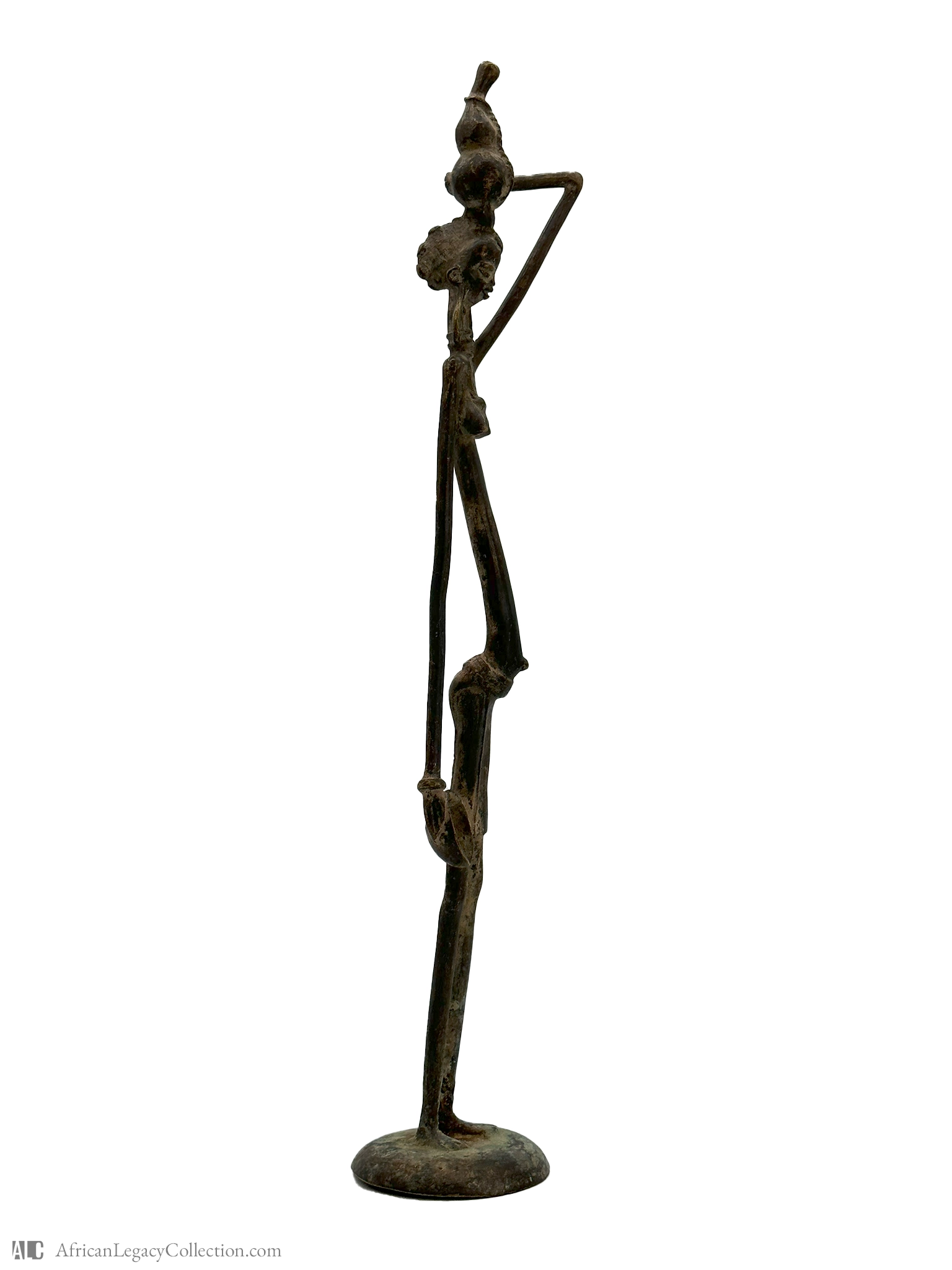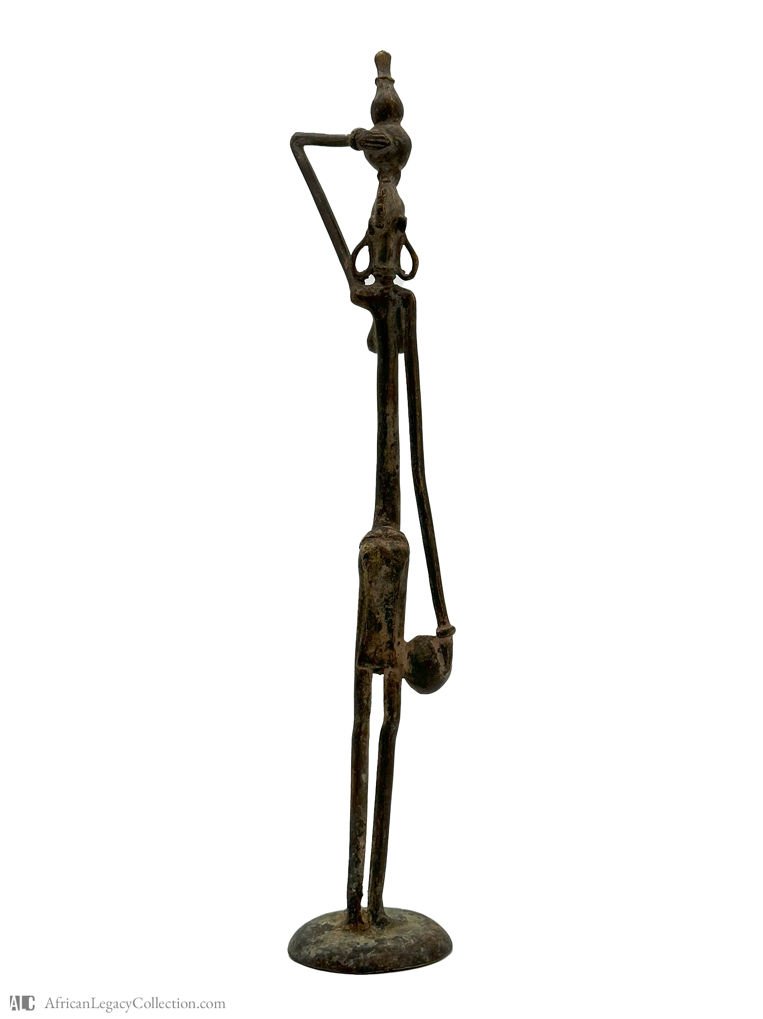 The artifact is crafted using the lost-wax casting technique, a traditional method for creating detailed metal sculptures. The historical context of such figures often ties back to the rich artistic traditions of African cultures, highlighting their craftsmanship and artistic expression. This piece is emblematic of the region’s artistic legacy and cultural significance.